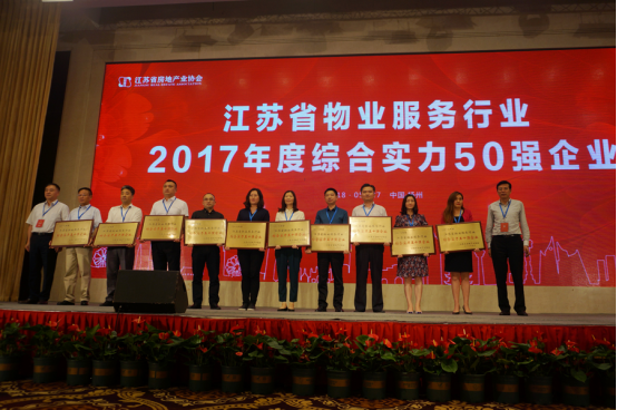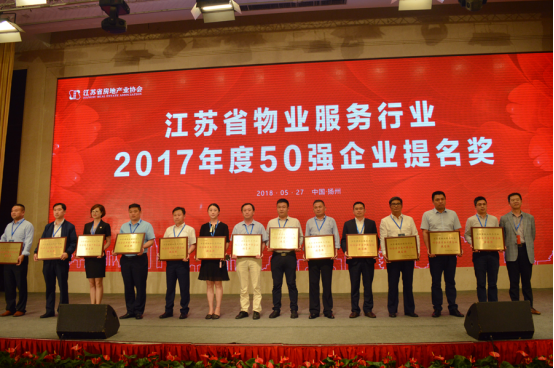 会议同时对获得“2017年度江苏省物业服务行业综合实力50强企业”“2017年度江苏省物业服务行业50强提名奖”以及“2017年度江苏省物业服务行业50强发展进步奖”这三项荣誉的优秀物业企业进行了颁奖授牌。